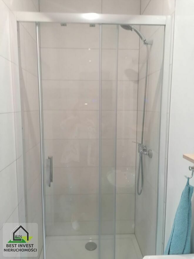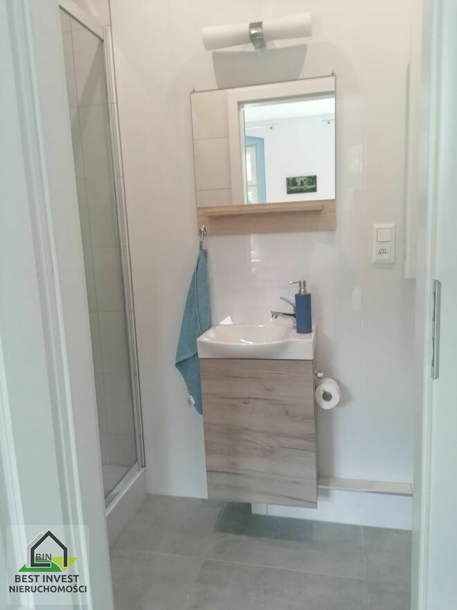 Układ: salon z aneksem kuchennym, sypialnia, przedpokój, łazienka z kabiną prysznicową i WC