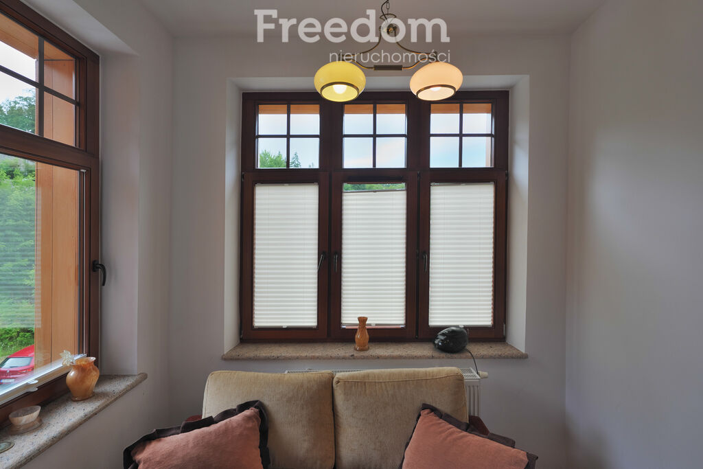 okien rozciąga się widok na otaczające góry i rzekę Kamienna.